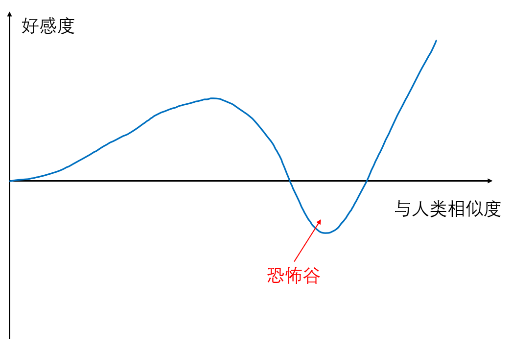 恐怖谷效应的曲线通常呈现为一个U形或倒U形,其中横轴代表机器人或动画角色的人类相似度,纵轴代表人们对其的情感反应。在曲线的左侧,当机器人或角色看起来不像人类时,人们对它们的情感反应是中性的或积极的。随着相似度的增加,情感反应也会增加,直到达到一个峰值,这时人们开始感到不安或恐惧。如果继续增加相似度,越过恐怖谷,人们的情感反应会再次上升,因为机器人或角色看起来几乎和人类一样。